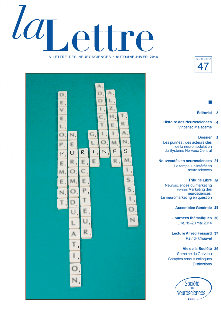Parmi les molécules de signalisation purinergiques mises en évidence à ce jour, ATP et adénosine ont reçu une attention particulière de par leurs effets considérables tant au niveau périphérique que central. L’importance de l’ATP et de l’adénosine dépasse largement le champ des neurosciences puisque ces molécules de signalisation sont notoirement impliquées dans la régulation homéostatique de nombreux tissus et jouent un rôle primordial dans la régulation du système immunitaire. En dehors de leur implication physio-logique, les transmissions purinergiques jouent notamment un rôle prépondérant dans les situations de stress cellulaire ou tissulaire et sont souvent présentées comme des signaux indicateurs de danger.Dans le système nerveux, l’ATP est libéré par les terminaisons axonales ou par les cellules gliales pour activer notamment des récepteurs ionotropiques : il est donc considéré comme un neurotransmetteur ou un gliotransmetteur. Ce même ATP est également à l’origine de la production d’adénosine qui cible des récepteurs neuronaux et gliaux. Par leurs multiples actions sur la modulation de la transmission synaptique ou sur les récepteurs métabotropiques, les purines sont aussi considérées comme des modulateurs.