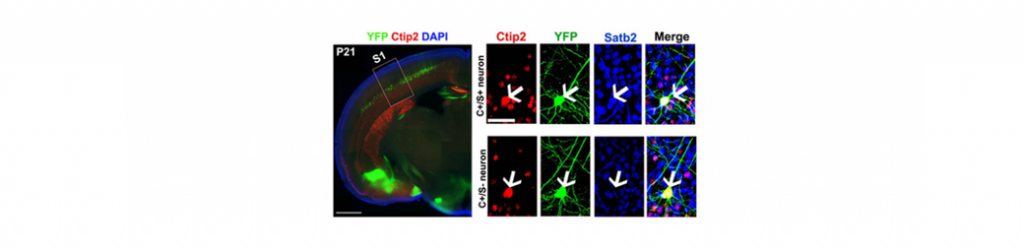 Le cortex cérébral traite l’information sensorielle de notre environnement en activant les réseaux de neurones excitateurs et inhibiteurs interconnectés les uns avec les autres. Cela permet aux neurones pyramidaux de la couche V d’émettre une réponse motrice nécessaire à l’élaboration de nos émotions et de nos comportements. Ces neurones sont les principaux chefs d’orchestre du cerveau et transmettent des signaux électriques complexes à la moëlle épinière à travers le faisceau pyramidal ou à l’autre hémisphère cérébral grâce au corps calleux. Pendant l’embryogénèse, les régulateurs transcriptionels Ctip2 et Satb2 se répriment réciproquement en permettant le développement des deux populations de neurones pyramidaux, les sous-corticaux et les calleux.