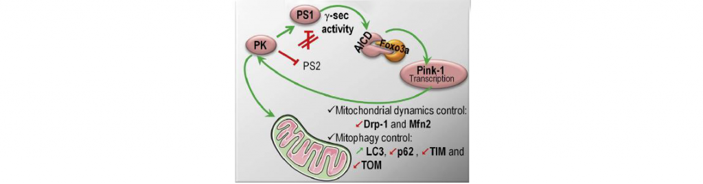 Les altérations de la dynamique mitochondriale et des processus mitophagiques sont deux des stigmates histologiques caractérisant la maladie d’Alzheimer. Peu de travaux concernent les mécanismes moléculaires qui sous-tendent ces dysfonctions. Le groupe de Cristine Alves da Costa à l’IPMC de Valbonne (Goiran et coll. Biol. Psy., 2017) a découvert que la fonction mitophagique contrôlée par PINK1 est régulée par les présénilines, ces protéines qui, quand elles sont mutées, rendent compte de la majorité des formes familiales de maladie d’Alzheimer. Ces présénilines, qui portent l’activité g-sécrétase, libèrent un fragment appelé AICD (APP Intracellular Domain) qui régule la transcription de PINK1 par un mécanisme dépendant de Foxo-3a. Ce travail est la première explication mécanistique des altérations mitophagiques dans la maladie d’Alzheimer.
