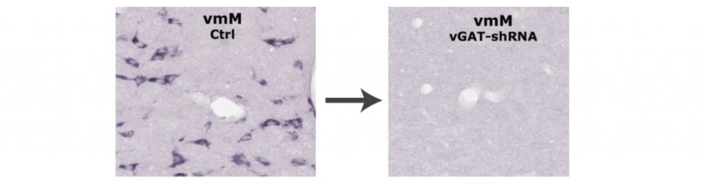 Après avoir décrit les neurones glutamate du tegmentum pontique générateurs du phénomène (Valencia Garcia et coll., Brain 2017), nous avons cette fois-ci identifié l’ultime maillon du réseau neuronal mis en jeu pendant le SP. Par une combinaison de techniques neuroanatomiques chez le rat, nous avons d’abord démontré que les neurones inhibiteurs actifs pendant le SP et afférents aux motoneurones somatiques (crâniens et spinaux) sont exclusivement localisés dans la formation réticulée ventromédiane (vmM) du bulbe rachidien, et non comme généralement admis jusqu’à maintenant dans la moelle épinière. Pour caractériser leur implication fonctionnelle supposée dans l’expression du SP, nous avons obtenu leur inactivation génétique (knockout) par l’infusion locale de vecteurs viraux (AAVs) véhiculant un short-hairpin ARN dirigé contre les ARNs du transporteur vésiculaire du GABA/glycine (vGAT-shRNA), bloquant ainsi définitivement et en quelques jours seulement la production de ce transporteur dans les neurones GABA/glycine visés. Bien qu’encore fonctionnels dans le vmM, ces neurones deviennent incapables de sécréter leurs neurotransmetteurs dans l’espace synaptique et donc d’inhiber leurs cibles post-synaptiques (i.e. les motoneurones), comme déconnectés des réseaux neuronaux auxquels ils appartiennent. Bien que profondément endormis, les paupières fermées et isolés de l’environnement, les rats ainsi traités dans la vmM ne sont plus paralysés pendant le SP (perte définitive de l’atonie musculaire) et exécutent des mouvements anormaux brusques, violents, incontrôlés, parfois coordonnés (reptation, prise alimentaire, etc), reflétant probablement l’expression de leurs rêves.