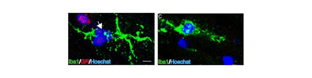 L’inflammation dans le cerveau est orchestrée par les cellules gliales dont font partie les cellules microgliales, macrophages du cerveau. Leur activation est présente dès les premiers stades de la maladie de Parkinson, maladie caractérisée par une perte massive des neurones dopaminergiques de la substance noire. De nombreuses études ont indiqué que les neurones dopaminergiques étaient particulièrement sensibles aux facteurs proinflammatoires. L’activation précoce et continue des microglies pourrait donc participer au processus de mort neuronale. En condition normale, la réponse inflammatoire induite par l’activation de récepteurs à la surface des cellules microgliales est finement régulée pour éviter tout dommage cellulaire. Les glucocorticoïdes (cortisol chez L’homme), via son récepteur (GR) est un acteur central de cette régulation en contrôlant l’expression des gènes inflammatoires. Or, des niveaux élevés de cortisol sont observables chez patients atteints de la maladie de Parkinson, suggérant une dérégulation de ce système et donc une potentielle implication dans cette pathologie. Dans une étude antérieure, l’équipe de Sheela Vyas avait montré l’impact délétère de l’invalidation du GR microglial sur la survie des neurones dopaminergiques dans un modèle murin de la maladie de Parkinson. Une augmentation du niveau d’expression d’un récepteur de l’immunité microglial, le TLR9, avait été notamment observée dans ce modèle murin mais également dans le cerveau de patients parkinsoniens.