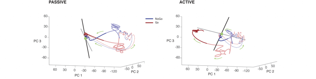 Dans une étude publié dans Nature Communications, Sophie Bagur et collègues ont montré que le cortex auditif primaire encode toutefois bien davantage que les seules propriétés sensorielles des sons, et représente de manière précoce le sens du stimulus, de façon similaire au cortex frontal. Pour parvenir à cette conclusion, le groupe mené par Yves Boubenec et Srdjan Ostojic, les deux auteurs senior de cette étude, a comparé l’activité du cortex auditif du furet dans deux contextes différents : lorsque l’animal écoute passivement deux sons, et lorsqu’il discrimine de manière active les mêmes stimuli en répondant à l’un (son cible) et pas à l’autre. En analysant au niveau populationnel l’activité de l’ensemble des neurones enregistrés, les auteurs ont montré que le type de codage dépend de façon drastique du contexte. Dans le cas de l’écoute passive, l’activité représente comme attendu de façon symétrique les propriétés sensorielles des deux sons. Lors de la discrimination active, l’activité populationnelle amplifie par contre fortement le son cible, et reflète sa signification comportementale de façon analogue au cortex frontal. Ce changement induit par l’engagement dans la tâche repose en partie sur des modifications d’activité spontanée, suggérant un rôle nouveau pour celle-ci dans le codage.