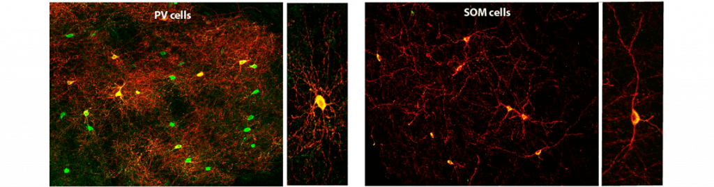 Tout d’abord, ils ont exploré la distribution et les propriétés des interneurones PV et SOM dans le DMS et le DLS. Ces expériences ont mis en évidence des différences de densité cellulaire, de propriétés électrophysiologiques et de connectivité des interneurones PV et SOM en fonction de leur appartenance au DMS ou DLS. Grâce à une combinaison d’approches électrophysiologiques (in vivo et ex vivo) et d’optogénétique, les chercheurs ont exploré si ces propriétés entraînaient des différences dans leur fonction au sein des deux territoires. L’optogénétique permet de contrôler l’activité de neurones ciblés avec de la lumière ; les interneurones PV et SOM peuvent donc indépendamment être activés ou inhibés pour évaluer leur impact sur l’activité du striatum ou de ses structures cibles. L’utilisation de cette technique a permis de montrer que les deux microcircuits GABAergiques ont des fonctions différentes dans le DMS et le DLS : les interneurones PV exercent un contrôle efficace du DLS alors que les interneurones SOM ont un rôle prépondérant dans le DMS. Enfin, bien que les interneurones GABAergiques sont normalement cantonnés à un rôle d’inhibition, les chercheurs ont montré que, dans le DMS et le DLS, les deux types d’interneurones PV et SOM peuvent être soit inhibiteurs soit dépolarisants en fonction de l’état d’activité du striatum.
