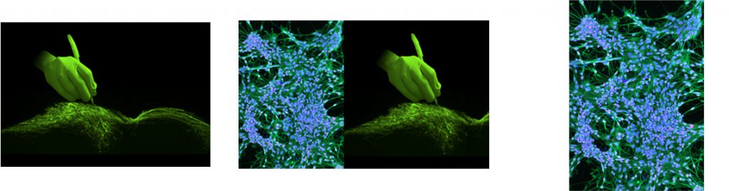 Axons of electroporated retinal ganglion cells in the optic tract and invading their brain target (dLGN) (fluorescence microscopy), and photography of a PhD student hand.