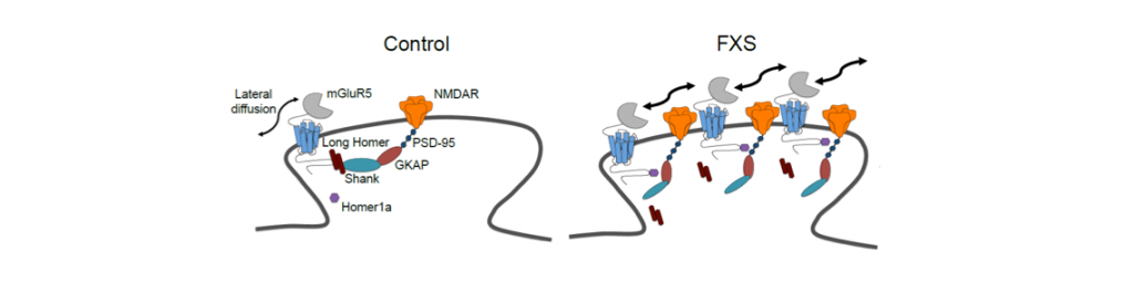Des travaux antérieurs ont démontré que l’interaction entre mGluR5 et les formes longues de la protéine d’échafaudage, Homer, est réduite chez les souris déficientes pour le gène Fmr1 (modèle murin pour SXF) et que ces altérations sont causées par une surexpression de Homer1a, l’une des isoformes d’Homer. Les conséquences de cette interaction altérée pour la dynamique des récepteurs n’avaient cependant pas été étudiées auparavant.