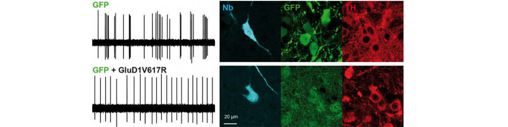 L’activité des neurones dopaminergiques in vivo présente deux profils distincts : soit une activité électrique régulière à basse fréquence, soit des bouffées d’activité électrique à haute fréquence. Ce second mode de fonctionnement est associé à un pic de libération de dopamine dans le cerveau. Des enregistrements in vivo ont révélé que les souris dont le récepteur GluD1 est muté ou absent ne présentent plus d’activité haute fréquence, démontrant la relation entre GluD1 et l’activité physiologique des neurones DA.