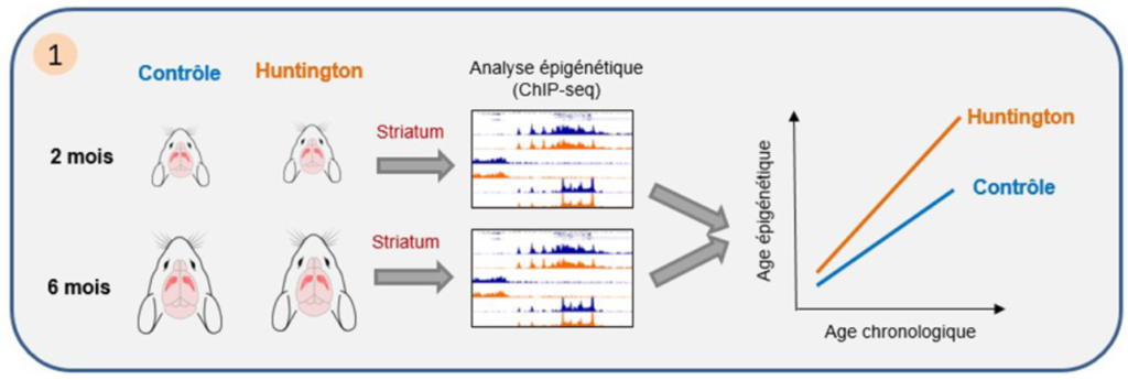 On savait que l’expression des gènes de l’identité striatale et l’acétylation de la chromatine associée étaient réduites chez les patients Huntington et chez des souris modèles symptomatiques. Cette nouvelle étude révèle que la perte sélective d’acétylation des histones au niveau des gènes de l’identité striatale se met en place très précocement, bien avant l’apparition des déficits moteurs chez la souris, et que ce processus a pour effet une accélération des mécanismes épigénétiques liés au vieillissement.