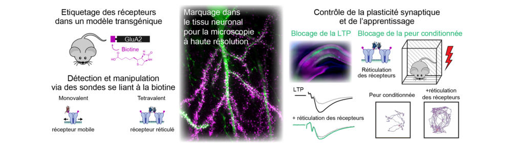 Dans le travail publié dans Science Advances, nous avons développé un nouveau modèle de souris génétiquement modifiée et une panoplie d’outils moléculaire et un instrument d’imagerie qui nous permettent maintenant de dépasser cette limite et mesurer et manipuler la mobilité des récepteurs dans le tissus cérébral intact, jusqu’à in vivo. En utilisant le modèle des récepteurs AMPA du glutamate, qui sont sous-jacents à la transmission excitatrice dans le cerveau, nous avons utilisé une technique d’étiquetage de la sous-unité GluA2 de ces récepteur avec une séquence peptidique qui permet l’ajout un résidu biotine en présence de l’enzyme biotine ligase. Dans le modèle de souris que nous avons développé, toutes les sous-unités GluA2 sont étiquetées, mais sont uniquement biotinylée dans les neurones dans lesquels nous exprimons la biotine ligase. La puissance de cette méthode permet de réaliser un marquage spécifique des récepteurs dans des populations de neurones déterminées. Ce marquage spécifique nous donne d’une part accès à l’utilisation de techniques d’imagerie à haute résolution dans les tissus, et d’autre part nous permet de contrôler la mobilité des récepteurs à l’aide de ligands multivalents de la biotine. Nous présentons de ce point de vue le développement d’une nette amélioration de la technologie d’imagerie par feuille de lumière, qui permet de mesurer la mobilité des récepteurs endogènes dans des tranches de cerveau. Nous appliquons cet ensemble de technologies pour établir que les récepteurs de types AMPA endogènes sont bien mobiles dans le tissus cérébral, ainsi que nous l’avions prédit à partir de nos travaux sur cellules en culture, et que cette mobilité est indispensable pour la potentialisation à long terme et certaines formes de mémoire conditionnelle. Ce nouveau modèle expérimental et cette boite à outil va nous permettre d’une part d’explorer les propriétés et le rôle de la mobilité des récepteurs AMPA et pourra d’autre part être appliquée à tout un ensemble d’autres protéines membranaires tels que d’autres types de récepteurs, canaux ioniques ou des protéines d’adhésion.